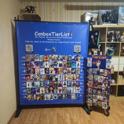 Wir wollen eine TierList als Wand auf Cons bringen. Dafür haben wir ein Werbebanner gestaltet, das mit Gestell etwa 1,60 m breit und 1,80 m hoch ist und Platz für 85 Fotos bietet. Es werden natürlich mehr Fotos mitgebracht. Zusätzlich zu der mobilen Conbox können wir sowohl eine feste als auch eine mobile TierList mit verschiedenen Mottos anbieten. Außerdem wollen wir eine Stempeljagd anbieten mit kleinen Preisen wie z.B. Schlüsselanhänger und größeren Preisen.